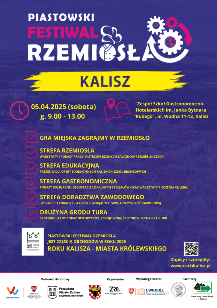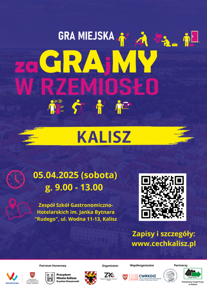 Serdecznie zapraszamy na Festiwal Rzemiosła oraz Grę Miejską „ZaGRAjMY w RZEMIOSŁO”, które odbędą się 05.04.2025 roku (sobota) na terenie Zespołu Szkół Gastronomiczno-Hotelarskich im. Janka Bytnara „Rudego” przy ul. Wodnej 11-13 w Kaliszu, od godziny 09.00 do godziny 13.00.